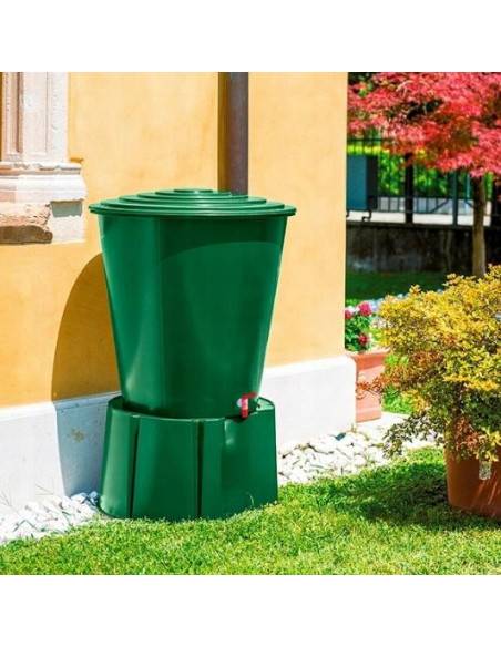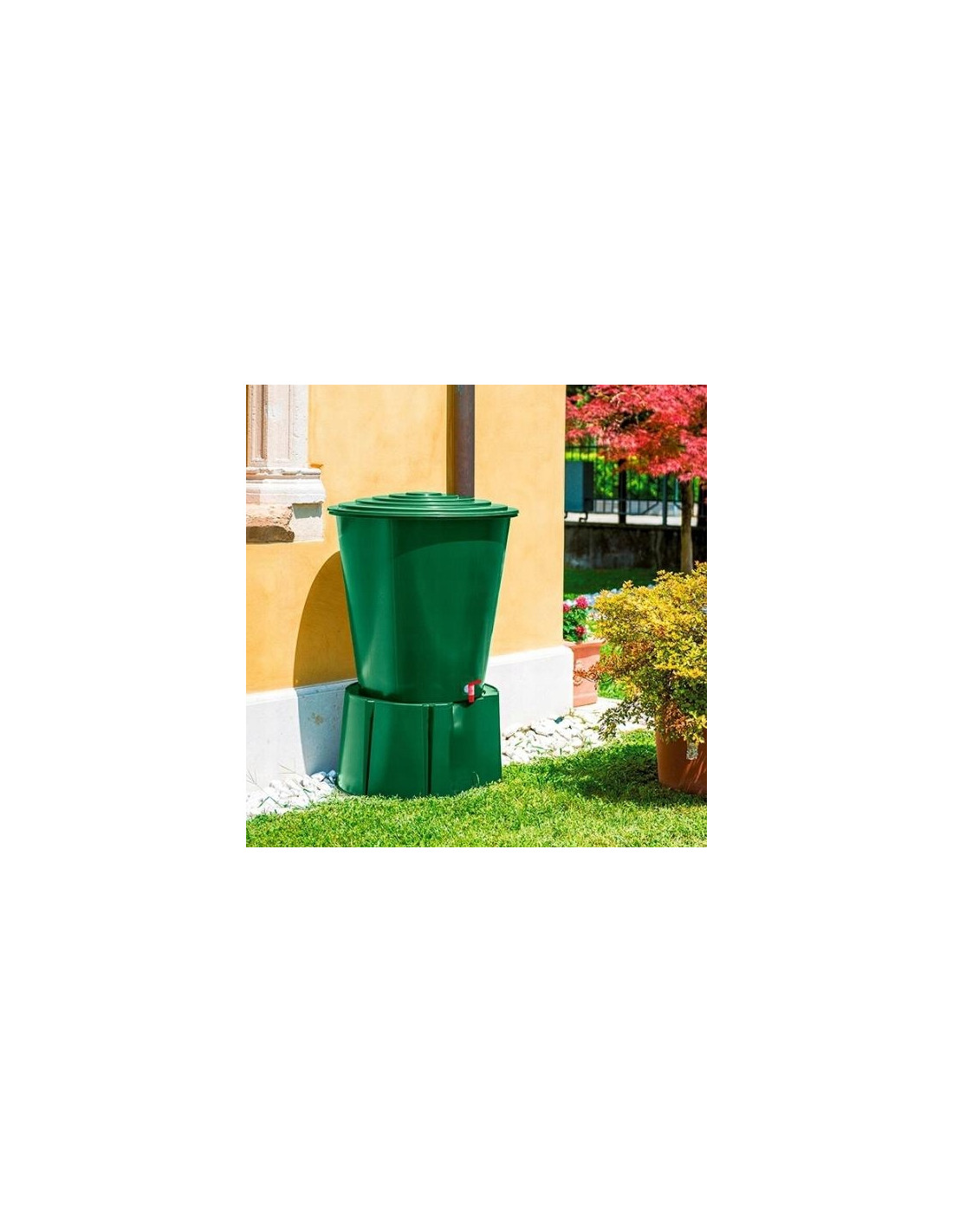 Pojemniki do zbierania wody deszczowej, zaopatrzone w bezpieczne mocowanie. Wykonane w kolorze zielony ładnie komponującym się w ogrodzie. Możliwość dokupienia podstawy/podwyższenia.